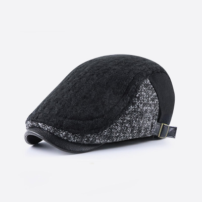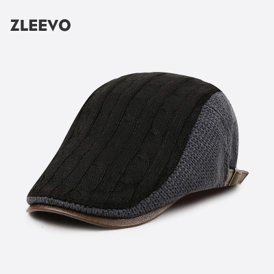秋冬新款前进帽中老年休闲鸭舌帽男士毛线拼接时尚英伦贝雷帽