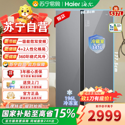 海尔 BCD-537WGHSSEDSN 对开门 537升 钢化玻璃面板 自动除霜 变频风冷 1级能效 家用大容量智能控温