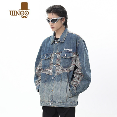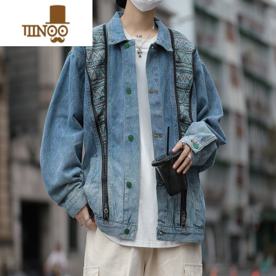 YANXU美式高街设计感拼接牛仔外套男潮牌复古水洗宽松翻领休闲夹克