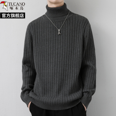 啄木鸟2024秋纯棉高领毛衣男士纯色休闲冬季新款打底针织衫线衣服