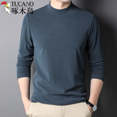 啄木鸟秋季男士中年长袖T恤德绒体恤半高领纯色上衣服休闲打底衫