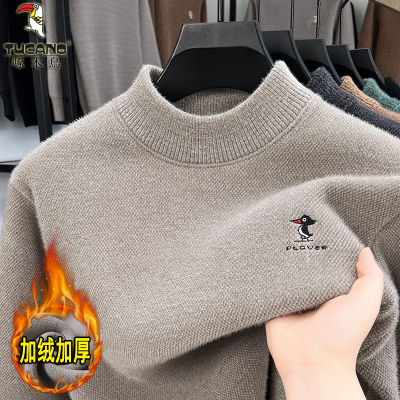 啄木鸟半高领加绒加厚男士毛衣2025冬季一体绒保暖羊毛针织打底衫