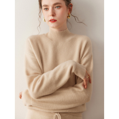 一线成衣山羊绒秋冬新款卷边女半高领宽松套头羊毛针织打底衫毛衣