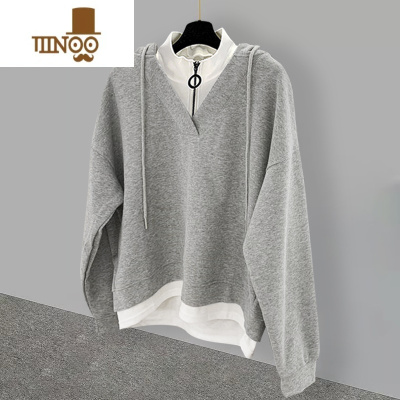 YANXU半高领假卫衣男秋季韩版潮流百搭帅气学生宽松连帽长袖上衣潮