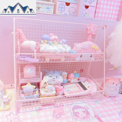 三维工匠粉色少女心铁艺双层架大容量化妆品收纳柜整理盒宿舍收纳架收纳盒