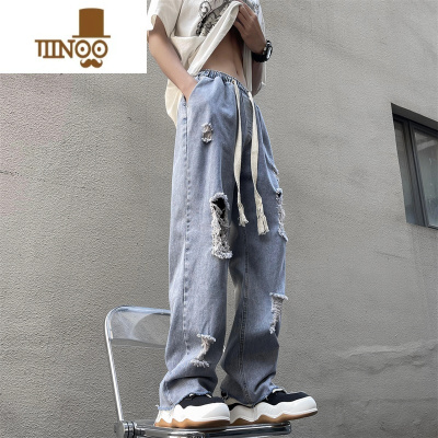 YANXU欧美高街vibe裤子美式街头白色牛仔裤男款夏季直筒宽松破洞乞丐裤