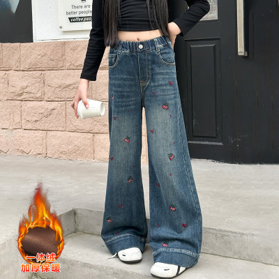 女童牛仔裤冬装新款初中生裤子女大童加绒直筒裤13岁女孩长裤