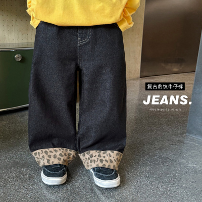 童酷男童秋款复古豹纹拼接中小童长裤洋气百搭宽松儿童牛仔裤