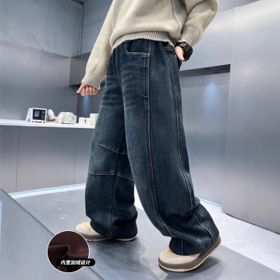 男童加绒牛仔裤年新款宽松一体绒中大童韩版加厚直筒休闲裤潮