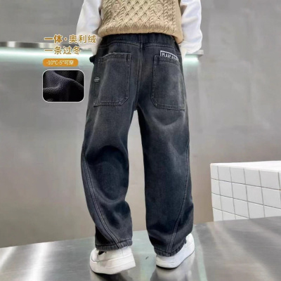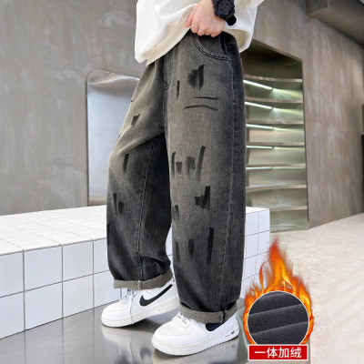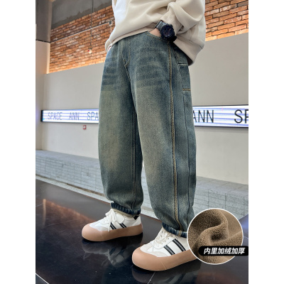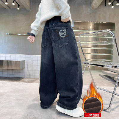 男童加绒牛仔裤宽松直筒保暖裤子冬装青少年中大童加厚一体绒长裤