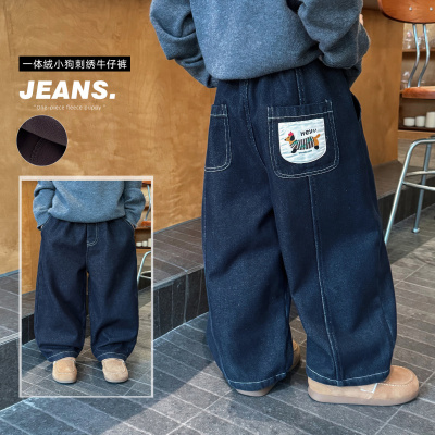男童加绒牛仔裤秋冬新款中大童痞帅厚直筒老爹裤儿童阔腿裤子