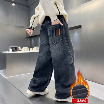 男童秋冬款裤子加绒加厚新款直筒牛仔裤初中生冬季儿童一体绒