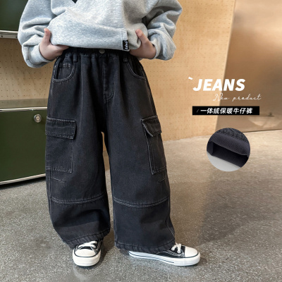 儿童装男童加绒裤子新款冬季男孩大童一体绒秋冬款加厚牛仔裤
