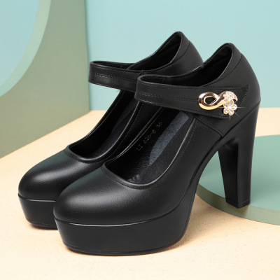 新款防水台皮鞋女时尚防滑走秀鞋女高跟粗跟圆头大码黑色女工作鞋