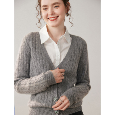V领羊绒开衫女纯色双股加厚开衫小麻花宽松显瘦针织外套毛衣