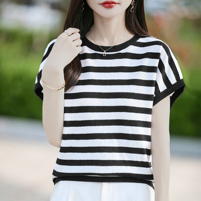 夏季新款时尚女装针织短袖圆领条纹T恤宽松套头撞色上衣外套