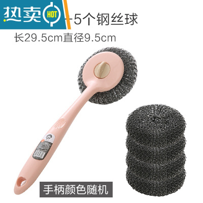 敬平长柄锅刷厨房清洁洗锅刷子家用去污多功能洗碗刷锅钢丝球刷锅器 1个手柄+5个钢丝球刷头