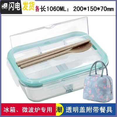 三维工匠耐热玻璃带筷勺饭盒韩国带盖便携保鲜盒微波保鲜碗便当盒 三隔带筷勺1060蓝/送保温包