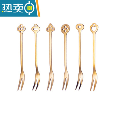 敬平6支装水果叉套装可爱创意小叉子家用欧式水果叉不锈钢签果叉套装 金色A40 6件套牙签