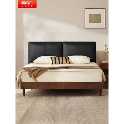喜临门 - 黑白格皮床 头层牛皮实木床 双人中古风高脚大床