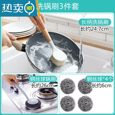 敬平家用厨房清洁刷子去油污长柄榉木洗锅刷不伤锅刷碗炊帚刷刷锅器 洗锅刷+长柄钢丝球锅刷