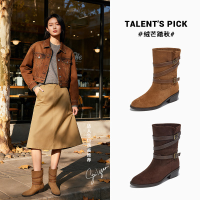 复古皮带扣西部靴新款冬季瘦瘦靴粗跟英伦风短靴女百搭靴子女