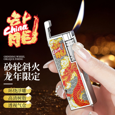 限定砂轮斜火充气打火机环绕浮雕高档男士定制送男友