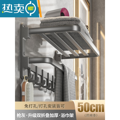 敬平太空铝毛巾架免打孔双折叠枪灰色浴室置物架卫生间浴巾架厕所壁挂 枪灰-2022升级[双折叠]加厚浴巾架50c