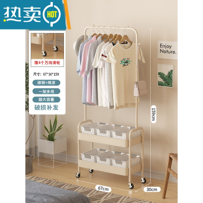 敬平可移动晾衣架落地卧室衣帽架一体脏衣篮子简易收纳置物睡觉放衣服 米黄-双层[U型拱门]