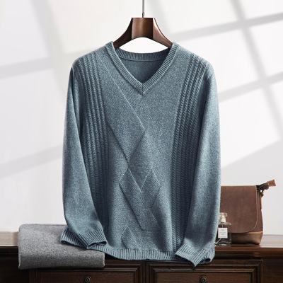 秋冬v领男士套头打底衫大码宽松鸡心领提花毛衣男中年加厚羊绒衫