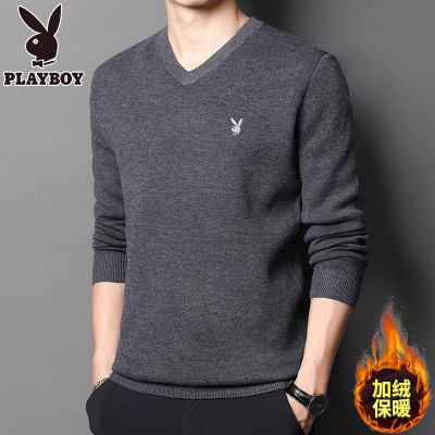 花花公子2024冬季加绒毛衣男V领保暖加厚款鸡心领宽松针织打底衫