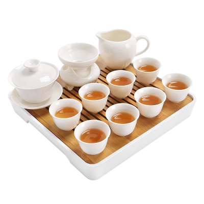 常生源 茶具套装 简约白瓷功夫茶具茶杯带竹面储水式茶盘 白瓷映雪干泡套组