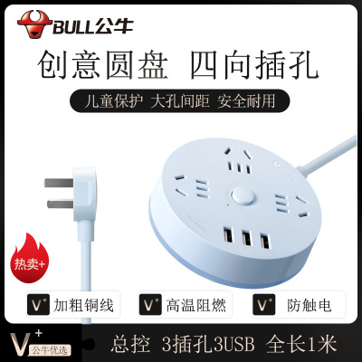 公牛插座R203U全长1米蓝色圆形usb充插排接线板多功能插板插排拖线家用圆盘学生宿舍床头插线板/拖线板