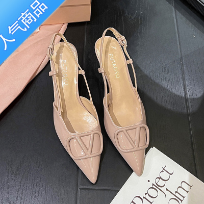 SUNTEK裸色漆皮尖头V家V扣细跟高跟鞋女2023年夏新款一字扣后空包头凉鞋