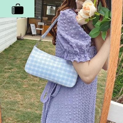 2020春夏新款复古格子包单肩斜挎包法式腋下包女百搭白蓝法棍包潮NEW LAKE 浅蓝白格女士单肩包