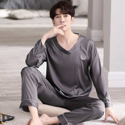 秋冬季冰丝睡衣男士长袖休闲宽松仿真丝加大码家居服套装