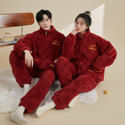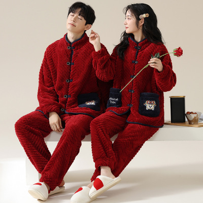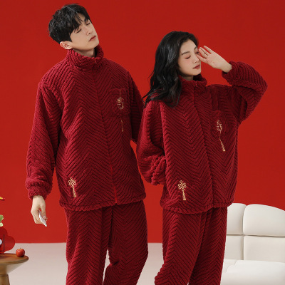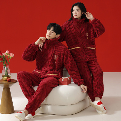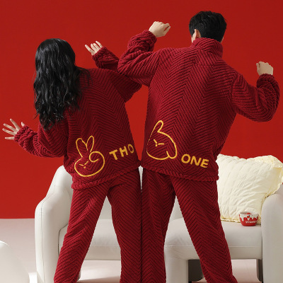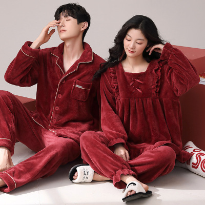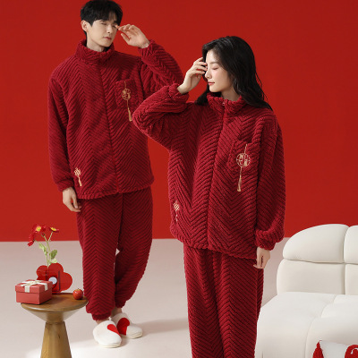 情侣睡衣秋冬季珊瑚绒本命年喜庆结婚大红色一男士一女家居服套装