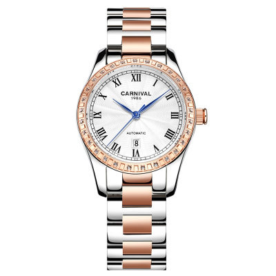 瑞士嘉年华Carnival手表正品女士全自动机械表 女表防水罗马新款镶钻简约时尚日历腕表潮流韩版女表8051
