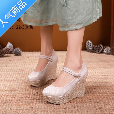 SUNTEK春新古风女鞋汉服鞋子民族风坡跟古风超高跟防水台绣花鞋国风布鞋