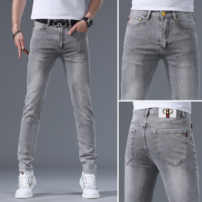 夏季薄款浅灰色牛仔裤年新款百搭欧货弹力轻奢男士修身小脚裤
