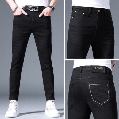 欧货牛仔裤男夏季薄款新款烫印个性潮流弹力修身小脚长裤子男