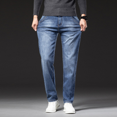 秋冬款中年男士牛仔裤宽松直筒高腰弹力水洗复古百搭浅色爸爸裤厚