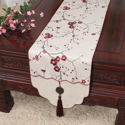 新中式古典玉桌旗茶几长条布艺中国风桌布床柜旗电视柜盖布 万福梅花红白 34*150适合桌长90-100CM