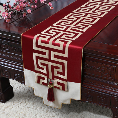 新中式古典玉桌旗茶几长条布艺中国风桌布床柜旗电视柜盖布 酒红格 34*250适合桌长190-200CM