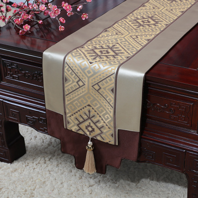 新中式古典玉桌旗茶几长条布艺中国风桌布床柜旗电视柜盖布 如意纹浅咖 34*150适合桌长90-100CM