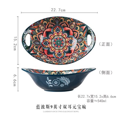 波西米亚家用烤盘手柄碗餐具套装高颜值饭碗双耳汤碗盘子蓝波斯9英寸元宝盘1036