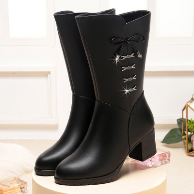 中筒靴女冬季新款加绒保暖高跟靴子舒适粗跟妈妈棉鞋中年女士皮靴