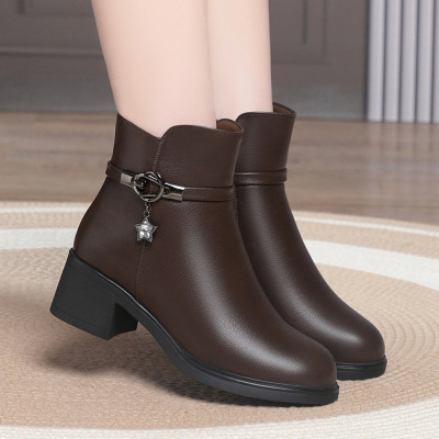 妈妈鞋棉鞋女冬新款皮靴粗跟短靴软底中跟加绒女士靴子中老年皮靴