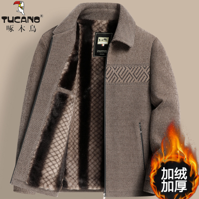 啄木鸟中老年人毛呢夹克男爸爸冬装外套加绒加厚冬季爷爷保暖棉衣