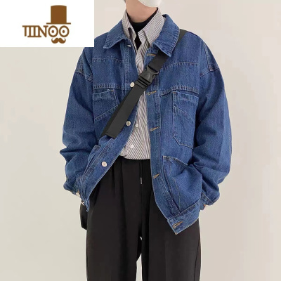 YANXU复古深蓝色牛仔外套男潮韩版宽松百搭翻领多口袋休闲工装夹克